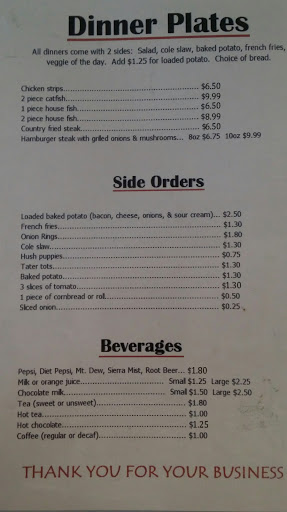 Good food, good portions. 2 eggs, 4 bacon strips, biscuit/gravy or toast $4.00, side of hash browns $1.50. Downfalls: noisy in the large dining area, no acoustics, gravy not hot (I believe it was plated before the food was cooked. Even though the parking area looked full at 9:00 AM, there were plenty of tables available for more patrons, plenty of space to sit at the counter. Left the restaurant with a full tummy and satisfied. Will be returning to eat there again. So far the best place to eat breakfast. 20 minutes outside of Cookeville.