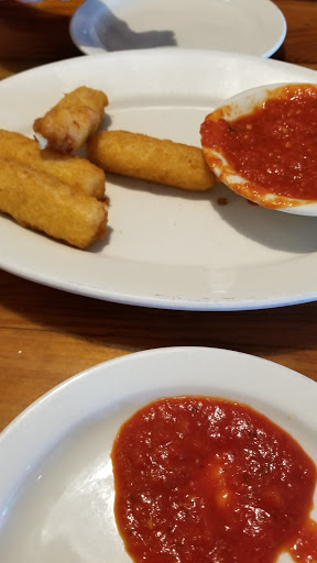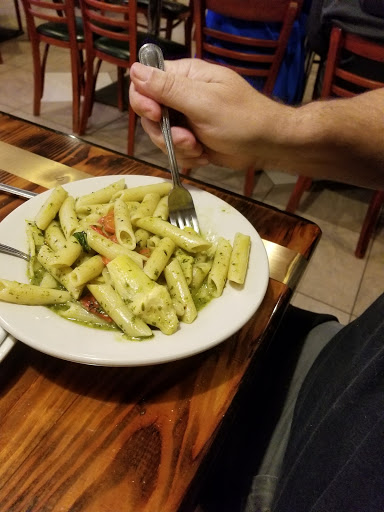 An Italian restaurant with a pizzeria atmosphere. I asked what drinks were available and no alcohol was mentioned, despite the neon beer ads on the wall. Lovely Italian music playing in the background and a football game on TV. My iced tea was served in a plastic Coca Cola cup. The Ravioli was excellent and the complimentary bread was superb. Waitresses were friendly and very helpful. Service was excellent.