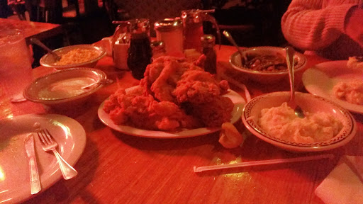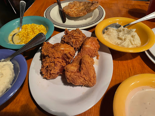 This is good southern cooking. If you didnt grow up in the south....it is a heavy meal for the uninitiated. This is real southern cooking. Reminded me of my mothers cooking. This is NOT diet food. We had the fried chicken. It is a little spendy but the food is great. You get chicken and unlimited sides. Sides you get are creamed corn, green beans, real mached potatoes and gravy. YUM!!!! Best chicken I have ever had in a restaurant. They also have Chicken fried steak, pot roast and catfish for the meat selection if chicken isnt your thing. The meal is about $13/person not counting drinks. My wife and I ordered the chicken. We got a whole chicken. This must have been a 50 lb chicken, pieces were large and meaty. We took several pieces home and ate for a couple more days. We went during the week and got right in. I image this place is a mad house on the weekend. Decor is has the facades of a small town, hardware store, auto repair shop. They have a water tower too. You walk into the restaurant under it. While we were there, one of the waitresses walked around with a microphone and sang Unchained Melody. She was pretty good. Good food, nice atmosphere, Ill be back.