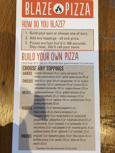 Ok, so Ive been to blaze a few times before but my very first time I was introduced to the place I was still getting over the fact they took over the Einstein Bros Bagel shop - still upset about that. Im sure there was a "reason" for them leaving but if I ever find out it was because of Blaze, Ill be reducing the star rating. You can order online or in-person, although when I tried to order online (via iPhone) tonight, it did not work and told me to call their help desk. No thanks! I opted to order inside, instead. You start the queue by picking out your pizza, they just need your style and name. Tell them build your own or one of the specialties they make, its that easy. They offer a variety of doughs but I always choose the regular dough - the almost-least-calorie option, second to gluten free. Im not a GF kind of guy but dont knock it if thats your style. After selecting your dough, theyll need to know the sauce, cheese and meat types... then top it off with any of their fresh all natural ingredients. You can ask for more or less of any item, still the same price. Then they cook it while you make your drink and have a seat! The service delivery at this place is pretty cool and laid back. The people that work there are kind, fun and seem to enjoy what they do. For some reason, I get a kick out of the oven guy who always says, "HOT," when taking the pizza out of the oven. Not sure why I think its funny but I guess its cause hes kind of monotone and says "HOT" in the same way every. single. time. The cashiers also ask you before you pay, how you are paying to confirm its on their screen correctly. One time, I was missing a "blaze" fire thing (rewards program) and they gave me one for free, see - nice! The food was delicious! Although the spicy red sauce is indeed spicy, I dont regret getting it each time I go. It has a great flavor. If you dont like spicy, you wont like it - so dont get it. The dough is cooked to perfection and the toppings are just melted enough to notice, I dont like burnt toppings so that works out great for me. If youd like something cooked extra well done, Im sure theyll be happy to oblige. The price is on par with like venues. Although "Pie 5" is nearby (across the street) and a little cheaper, I like the flavor and experience at Blaze much better. Youll pay about $8 for build your own and specialty pizzas, $7 for 1-2 topping and $6 or so for plain jane. $3 for a drink and they also have salads and desserts but Ive not tried them yet so Im not familiar with the price points. Try them out!