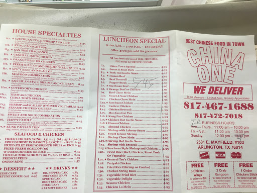 I LOVE China One! I lived in China, in Shanxi Province, and I am picky about my food. Their steamed dumpIings are the best- and huge! I recently ordered right before close or a large group. They stayed open for me to pick it up, helped me to my car, and loaded me up with extra sauces, wonton crisps, and fortune cookies. (Most of the cookies fortunes only said, "Your best fortune is in the next cookie." with the next Dreamworks Panda movie advertised. Recently, they hired a couple of people to man the phone who speak excellent English. In the past, it has been hard to understand and be understood, but no longer. Food can be a bit too salty at times, but it depends on what you order.