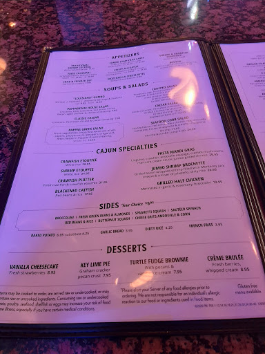 We went out to eat at the pappadeaux off of 30. The service was horrible to start. We sat there for 2 hours to eat hard bread. The food was not real great. I used to love this place and eat there 2 to 3 times a week. Its just going under. I can tell when our food was wrong i said its ok. No big deal. The manager came over to act like he was going to do something. We even ordered food to go and it sucked. We spent 300 and tipped 50. When i got home not real bananna fosters cheesecake. And to top it all off our lobster tails they messed up. They gave us split lobster tails like the ones ud order at fridays. Then said they would bring us new ones out. When i got home i looked in the bag and they were uncooked. I wont eat here again. Try eddie vs or nick and sams. I still tipped the horrible server 50 bucks because i know they rely on tips. Dont eat here.