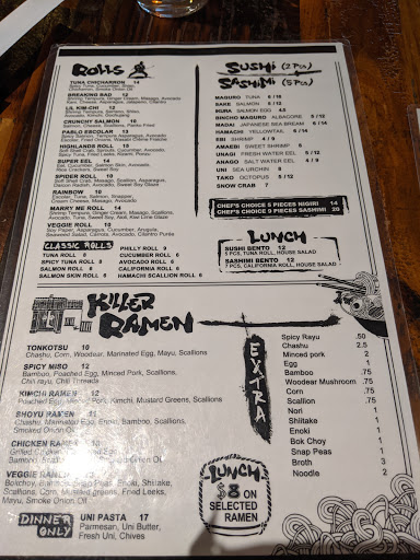 Absolutely awful. The sushi was the worst Ive ever had...and I once tried grocery store sushi out of curiosity. This place uses COCKTAIL SAUSE on the signature rolls! NEED I SAY MORE! Seriously, who does that!!? They obviously employ "chefs" who have no clue what theyre doing. Had the menu mentioned anything about slathering a number of their signature rolls with cocktail sause, I would of asked them to keep it off my plate. My soda had no carbonation and when I mentioned the funny taste to the waiter, he said, "oh yeah, we get a lot of complaints about our soda, Ill get you one from the bar". If they know its a problem, how about the manager fix the problem?!?! I felt bad for the waiter, I think he was the only one on staff. We were very nice to him but extremely disapointed. We were one of maybe 5 tables inside and it took the bar 15-20min to make our drinks...and we didnt order anything complicated. Most of the sushi rolls are premade and theyre disgusting (with or without cocktail sause). My friends roll came out 45min after everyone elses and when we asked to pay our bill, they used one of those old fashion cc swipers from the 80s and the poor waiter had to hand write/calculate each sushi roll plus tax and tally up the totals. It was ridiculous. Im shocked this place has more than 2 stars. I cant imagine that this place will be open much longer.