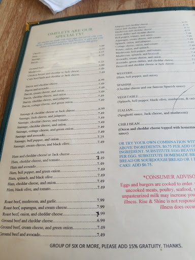 Friendly service...vomitous food. Rise and Shine looks like a down home, country kitchen, but its not. Our server was fantastic and knowledgeable about the menu. However, she neglected to tell us how bad everything was. We placed our order, and 5 minutes later.. (points for prompt service, I guess?) ...we were served an undercooked, wobbly omelette full of egg white snot, and a quesadilla that tasted like burnt beans and Palmolive . Kudos on the industrial sized bottles of Tabasco. Keep driving folks. Theres a McDonalds up the street.