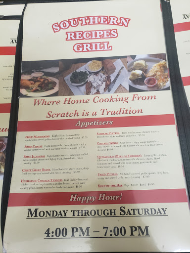 We were seated at a rear table in a corner (which in itself wasnt bad, but added to the treatment we received, it was abhorrent) by a waitress that didnt smille. She was like a robot. She asked what we wanted to drink before allowing us to get settled and look at our menus. After bringing us our drinks we asked her to give us a few minutes because we had kids with us. She stayed away so long until we had to ask another server to help us. Then our server came back and received our orders. Then we saw no more of her until our food came and she seemed unsure of who ordered what. She left abruptly upon putting our food on the table, not asking if everything was alright. I ordered cornbread but got a roll, but she left so quickly that I was unable to tell her. Afterwards no one came to our table to see if we needed anything else. Finally, we got the attention of a server who had been dutifully waiting on her guests. She reluctantly came over and I told her what I needed. When our server brought the bread it was rectangular bread in a small round bowl. Because the bowl was too small the bread was sticking out and laying again her hand. To add insult to injury, she reached her hand in my plate and picked up the roll. This to me was very rude and distasteful. She should have asked me to pass it to her because I had no intention of eating it, and I hope she had no intention of serving it to another unknowing diner. As much as I dont like playing the race card, I am going to do so now. There were three races of people in our group. We were seated at the back as if we would contaminate the all white clientele, or would cause to leave. We received very poor service while other guests were being promptly serviced. Not once were we asked if we needed anything and our server seemed not to want to wait on us. I will not go to this restaurant again and if you are a person of color beware. There is no excuse for bad service. My husband generally gives very good tips. I hope this time was an exception because the server didnt even do her job. She should not be in a position such as she has. I will be apologizing for weeks for suggesting my family eat at the Southern Recipes Grill.
