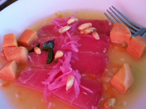 The ahí tuna was perfect and the mixed drink was delicious! But why am I paying these prices for mediocre waitstaff? I didnt even care that her shirt was filthy because she seemed helpful and upbeat...until she handed me my check to sign and then she matched her dirty shirt. Most staff wait until you leave the table to pick up the receipt but this chic was lnt even trying to hide the fact that she wanted to see her tip. I cant even imagine not tipping, even for bad service but she ruined the experience. Excellent Customer service is rare but I would expect it at this type of establishment. So although the food was amazing, I still wouldnt recommend alcomar to a friend.