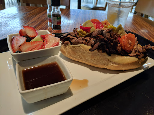 Large cafe with full bar and nice menu. They offer free WiFi and the grilled chicken sandwich was large and juicy. I will say it is expensive. I had a sandwich, bowl of soup and soda and it was over $15. They also have outdoor seating behind a fence to avoid the eyesore of Lamar.