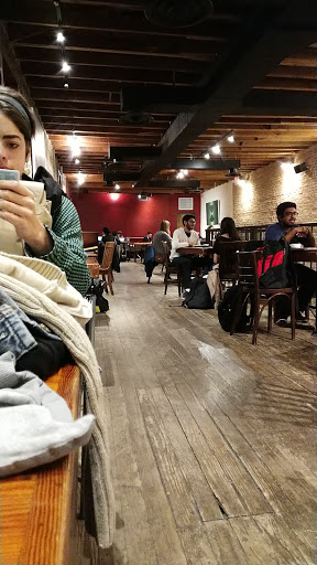 One of my TAs used to have his office hours at this location, so I went there quite often one semester. Its a lovely coffee shop and has two levels in it. The upper level is kinda dark and the lower equally bright. They have soy milk and organic milk options which Starbucks doesnt always have, so thats a plus. Their coffee is a tad overpriced but thats probably because its located at such a prime spot. You can always smell their coffee as you pass the shop by on your way to work or class. The staff is friendly. The shop also sells local products like Juicelands quirky juices.