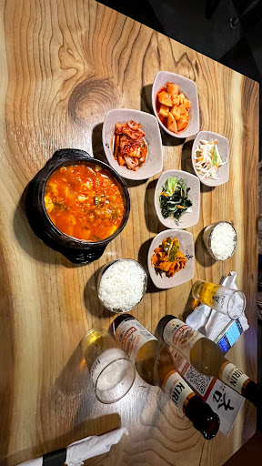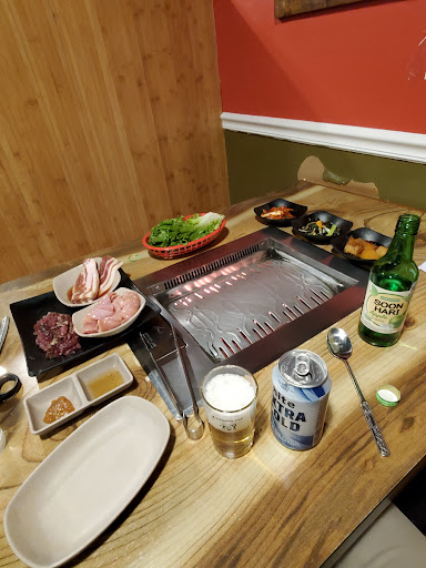 From the moment you walk into the door, the staff are friendly and inviting. At the barneque takes, you cook your own may, but are allowed as much of it and the sides as you can eat. If you are unsure how to cook an item, the staff shows you how. The unlimited barbeque option starts at about $25. The non-barbeque menu has a large array of options from meats to noodles to soups and everything in between. The menu items are less expensive per person and allows you to try more items or get more intricate items in the soups than you get free with the barbeque. For example, the kimchi chiguey in the barbeque has a few pieces of meat, but from the menu there may be seafood included. The mulnyeingmun on the barbeque trends to not have the meat and pear included with the a la cart item. There is also a good selection of soju and other alcohol products, but I havent bought them there, so I cant speak to the prices.