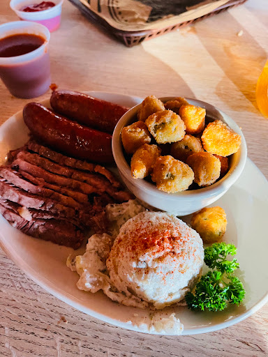 The view from the patio is gorgeous. My husband and I ordered the combo plate of ribs, brisket, and sausage when we went. The brisket and sausage were our favorites since we are from Memphis and accustomed to pork ribs, which dont seem as fatty as beef ribs. The garlic mashed potatoes were most excellent.