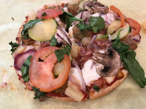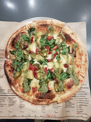 Interesting idea, its basically a customize your own pizza place. They start off by asking you what kind of dough, cheese, sauce, etc. you want and then you can add all the toppings you want for the same price of $8.29. I went with their original dough, a mix of ovalini mozzarella and goat cheese, spicy red sauce, and Italian sausage, grated garlic, and arugula. Overall, it came out pretty well. Its a very, very thin crust-style, thinner even than youd expect from a New York pizza place, to the point where its a bit crispy like a cracker. Overall, I enjoyed it. Its nothing fancy, but its fun.