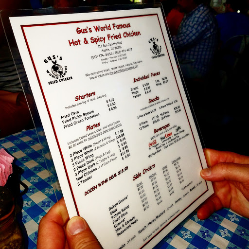 This is hands down the best fried chicken Ive ever had. Period! My previous favorites were the addictive flavoring of KFCs original recipe and the very juicy and crispy (but not oily) chicken from Lucys. Guss fried chicken is like the offspring if those two ever mated. The chicken is very moist, probably sitting in brine over night, and the skin is cooked close to if not golden perfection. The breading is not thick nor dry, but flavorful and spicy, not to mention addicting. The chicken comes steamy hot as they serve it straight from the fryer and watch out for that heat cause that breading keeps the chicken hot! The spiciness certainly sneaks up on you like a tiptoeing thief. While youre distracted with the hot juicy chicken covered in a wonderfully spiced skin, the heat (probably cayenne) picks your pocket and you wont even know it until you reach for the napkin to dab your forehead. The other beauty of this place is the fact that its not really that expensive. With the location situated between two high class steak houses in the heart of downtown Austin, I assumed that this would be a "fancy" fried chicken establishment. I was pleasantly surprised that you can get a 3 piece dark plate (1 drumstick and 2 very large thighs) with 2 sides all for under $10!! Thats a steal!! Now Im not sure if its a case of the chicken raising the standard so high that the sides could never compare or that the sides are just simply not very good, but lets be honest, youll come here for the chicken. Their coleslaw, collard greens, and sweet beans are the only sides that I believe should accompany this stellar chicken, but Im fine with getting some chicken with a side of chicken. My only regret is that there is only a single location to get this chicken. As this place gets more and more popular (and Im confident it will) the cramped parking situation of downtown Austin will sure make it a chore to get this heavenly chicken. I sure hope that they open a second location (perhaps on the Burnet food scene?) in the near future to promote their gospel of good fried chicken.