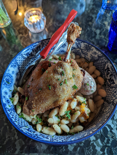 I did not really know what to expect with this place. The name implies brewpub, the ambiance a chic contemporary yuppie-hipsteraunt and the menu more french inspired upscale than either of the other two factors indicate. Came here on a date and we were sat almost immediately in this cozy little back room that was occupied by two other couples. The tables in the room were spaced a little awkwardly, but after I had a wine in my hand, I didnt much care. Their wine list was a bit all over the place, but I appreciated (and enjoyed a few of) their offerings and though a bit of a markup was evident, it was not to the point of price-gouging as you see on a lot of other uninspired and uninformed Austin wine menus. I started with their Domaine De Couron Rosé, which was just perfect to sip on by itself as we perused the menu. We started with the oeufs aioli and wow. Right off the bat, this place was already impressing me! The confluence of flavors from the aioli itself, boquerones, cornichon, and almond gremolata were magnificent! I had this with a glass of Paul Ponnelle Pinot Noir and it was a perfect flavor partner to these hard boiled egg flavor-boats. My date and I both ordered the Butter Poached Crab. I usually like to order different dishes and share, but neither one of us were in a sharing mood when we saw that the crab was in a vanilla cognac sauce. Definitely salvaged the evening by getting separate plates because we would have been fighting over the last morsel; this dish was a revelation! First off, the crab comes in the cutest little mason jar I think i have ever seen. And, though it appeared almost disappointingly small at first, it was actually quite stuffed to the brim with the most succulent and decadent crab I have ever tasted! I am not even the slightest bit ashamed to say I would bathed in that butter cognac sauce! Seriously, this dish was just one of those that you just dont want to end because you are in foodgasm heaven! I paired this one with their Mistinguett Cava, which was a match made in aforementioned foodgasm heaven! I prefer cava to champagne, regardless, but this was a fantastic pairing because you still have the acidity to cut the natural sweetness of the crab & sauce, but the slight sweetness at the finish of the cava was like a flavor boost to the crab, so the little kick at the end of each bite and sip was like getting a delicious little bonus. We ended the perfect meal with the perfect dessert: a Nutella & Banana Crêpe. The brûléed banana and lavender-vanilla sugar really gave an added flair and when complemented by the Grand Courtage Rosé, it really was a "great courtship" between the strawberry notes in the wine and the sweet lavender in the dessert. it was like sweet little lavender infused firecrackers were going off in my mouth! Needless to say, I was not only impressed, but awed by the food and wine offerings here, and that is saying something. The only two things that prevented a 5-star rating was the parking situation. There is just not enough of it. I usually dont discount stars for such trivial things, but having to try and scout a space for close to 15mins almost made me pick a different place for our date. The other one was our server was nice and attentive, but having to ask several times for water is a bit annoying in general, but especially when trying to cleanse my palate between wines (as pretentious as that sounds, I dont care, I would have hated to not been able to enjoy such an exquisite meal without readying my tastebuds for the next course of culinary ecstasy). Will definitely be back! I have my eye on that duck reuben...
