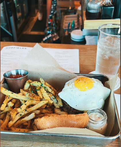 I found Hopfields on a Google search for best brunches in Texas. We met up with some friends this morning to try it out. I had the BLT, my husband had the Eggs Benedict, my girlfriend had the Oeufs Brouilles Aux Herbs and her husband had the The Maya. The brunch menu is small but has a very sophisticated offering. Everyone loved their selections. Mine was good but the bread was perhaps a bit too much for the ingredients. It came with herb crusted pommes frites (french fries) and a pot of aioli that were just sublime! My friends little boy loved the French style scrambled eggs she ordered so much that he ate nearly half her order! We finished off with the banana nutella crepe and the coffee creme brulee which were both excellent. The have a lovely selection of wines, beers and cocktails, as well. I had the Teiton Apricot which was very nice. My husband had Left Hand Brewerys Milk Stout, which he really liked a lot. The fellow next to us had the full English breakfast. He said hed highly recommend it so I think well be back to sample a few more items on the menu.