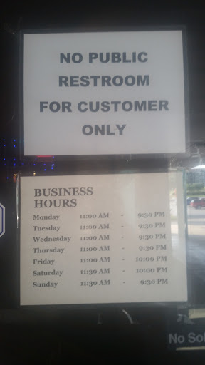 | Working: | 11AM–9:30PM 11AM–9:30PM 11AM–9:30PM 11AM–9:30PM 11:30AM–9:30PM 11:30AM–9:30PM 11AM–9:30PM |