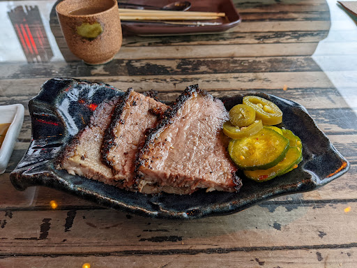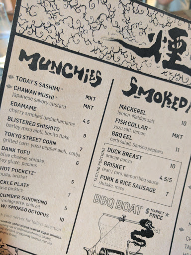 I love Tatsu-Ya Ramen, so when I saw Kemuri opened up, I was pretty excited. The layout of the menu is designed to be worked down - meaning you order some of the small plates from the top first, then middle, then bottom. I went with a group, and we started with some of the munchies and skewers. The pickle plate and the Shrooms and bacon skewer were excellent. I could have eaten 5 of the shrooms and bacon skewers. We moved on to some of the items from the smoked category - the BBQ boat was pretty great. Our boat came with eel, brisket, and pork loin. I would not recommend the pork loin, but the other two were delicious. The brisket completely fell apart in my mouth - excellent. We tried a handful of other things, but my favorite thing of the night was the Classic Karaage Chicken. The chicken was crispy and well seasoned. We tried some weird things too - monk fish liver, a raw pickled octopus... the waitress was very helpful in pointing us in the right direction as far as the odd things to try. It became a tasting adventure. Go in with an open mind and try as many odd things as you can. It is fun!