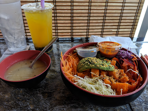 Been coming here for 3+ years. Food is delicious, healthy-ish, filling. Not full of sugar like other Asian places. Prices are very good for lunch & dinner, especially for downtown. Service is outstanding, with happy, energetic staff most of the time. They love to take care of their regulars like me, with complementary soups and add-ons sometimes. I feel like a member of the family when I enter, being greeted by name and with a smile. P Unfortunately it gets a large lunch crowd during a convention, due to its closeness to the convention center. If you are here for a show, expect a 15-40 min wait to order. Pro tip for vegetarians: try the obake bowl "A" all veg, add shatake mushrooms and avocado. Also a secret item not on the menu: teriyaki chicken with ginger added. I like it better than the regular teriyaki chicken. Also, there are humorous messages all throughout the place, that echoes The creativity and happiness of this awesome little restaurant.