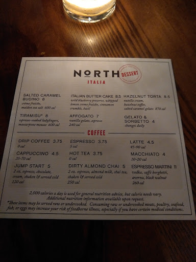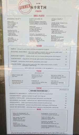 My family and I went to North for my fathers 60th birthday. I ordered the Mahgaretta (sp?) pizza, which was great, and my father ordered the lamb, which he said was the best lamb he had ever had. The menu is very limited but it seems, at least from my limited experience, the food is very good. It is pretty pricey however, so dont go unless you plan on spending a lot. My mom ordered soup and salad, which she wasnt very satisfied with. However, after the waitress took her dishes away the manager stopped by our table and asked if they could prepare anything else for her since she wasnt satisfied. My mom declined the offer, however he removed her order from our check without us asking or suggesting he do so. He found his way toward the front door and held it open for us as we left and gave us a firm handshake as he thanked us for eating in. The restaurant was busy the entire night, which makes the level of service even more extraordinary in my opinion. It is very rare it seems to go to a restaurant establishment that puts service above profit. Too many times have I seen a restaurant refuse to recognize you are dissatisfied with their food just to avoid having to reimburse you. In the end, that business model fails miserably. This is a prime example. If not for the great service the manager gave us I would probably not be writing this review because I rarely review anything online. I will recommend North to all of my friends.