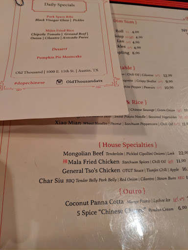 The food was interesting and more fusion that I expected. Things like "Brisket Fried Rice" and a sunchoke fried rice are on the menu. This is not the typical Chinese restaurant - but of course not, this is Austin. Over all the food was decent. Oddly enough, my favorite thing I ordered were the "Pickles" which is a bowl of lightly pickles cabbage. I also ordered the clay pot. While the food was tasty, there was a very obvious lack of protein - for the price, I expected about 25-50% more meat with the entree. I ordered a house cocktail called "The Nasty Woman" - props to the bartender for this name and the drink itself. The decor is very "hipster Austin" with some wallpaper that, in any other setting would be considered tacky, dark colors mixed with pops of colors and low lighting. The wait staff was attentive, and our waitress was polite while explaining the menu. Overall, I enjoyed Old Thousand and would probably go back. The pricing is a little steep, but that is to be expected in downtown Austin.