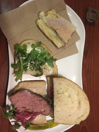 Pretty much your average Panera Bread with lots of seating. Decently priced yet uninspiring sandwiches. My order gets messed up way too often. How did my side of chips turn into the tiniest little apple Ive ever seen. At least give full-sized apples! Also I get confused when the staff tries to deliver my food to me as my buzzer goes off. How can they keep track of my location that well with so many people around? This is a Pepsi establishment. That means no Diet Coke (no one drinks Diet Pepsi). Fortunately there is the always-fantastic Dr Pepper.