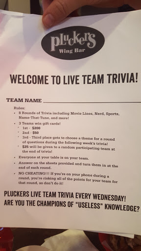Ive been to Pluckers several times. Its way overpriced (about 10 bucks for five wings and fries) and trivia night is annoying. The host is some RTF major with a microphone that just runs his mouth all night long. He thinks hes pretty funny. The place is always packed. The host staff makes it really difficult for me to want to go there because they act like seating is a big project if the entire party isnt at the restaurant at one time. Its really irritating. Also, the wait staff seems to have difficulty splitting up checks, even though they are located in a predominately student populated area.