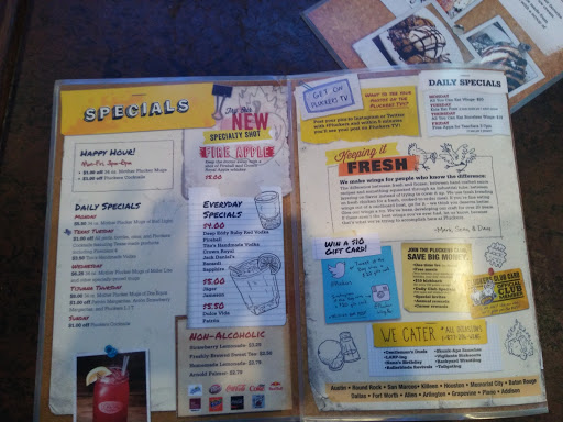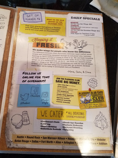 Pluckers is really good!! I come from Houston and the place to go to get some wings are from Wings and More, and I was afraid that coming to Austin I wouldn’t find a place to would get close to Wings and More. The Pluckers that I went to however, was very small, I think that that was probably that bad part of this experience that I had because it seemed that we were very crowded and it was distracting to not being able to be as comfortable. The service was great and the price was perfect for us students! They have a lot of variety as well, with coupons and specials that are always a plus, and even if you are not hungry once you’re there all of that changes! 5 out of 5 stars!