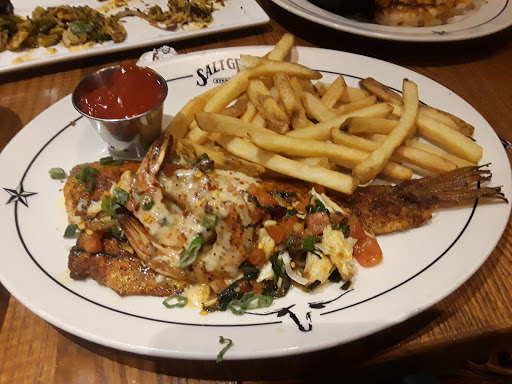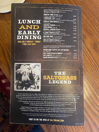 I hadnt been to Saltgrass in years, but I loved it in the past. I should have left the memory alone. I went on my birthday and ordered a 12 oz. NY strip, medium rare, seared on the outside. The steak was so over seasoned (with Im not sure what, as it was not mentioned on the menu), that I could barely see the poorly attempted searing. The cut of the steak was awful. There was so much ligament and fat in the cut that, out of 12 oz., I might have eaten 4 edible ounces. I left most of the steak on my plate and my friend took it home in a box for the dog. No one even asked how my meal was after it was served. Unbelievably disappointing.