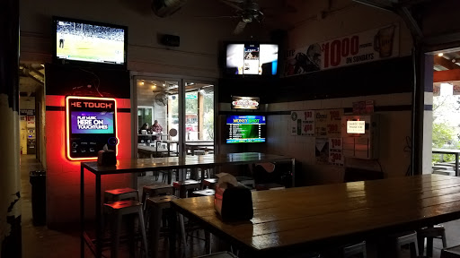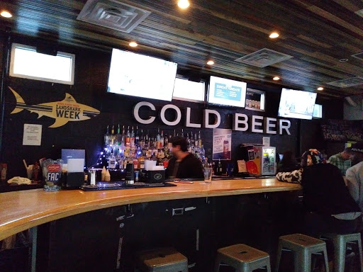 A cool, sports themed bar with a lot of indoor and outdoor seating