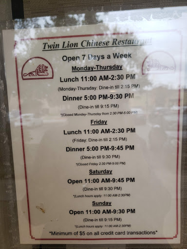I have been going to Twin Lion for 25 years. I have watched their family grow and grow up. Its amazing and wonderful to see the same people there time after time. Their food is delicious, the service is excellent, the menu never changes, and i think there has only been one price increase in all these years. The Wonton Soup is the best soup I have ever had and I have tried many others at different Chinese Restaurants. The Twin Lion Fried Rice - 5 stars. Wonderful Chicken - 5 stars. Chicken and Mushrooms - 5 Stars, Appetizers - 5 Stars.