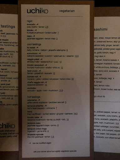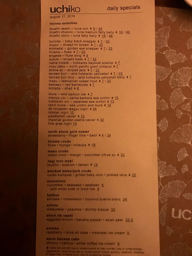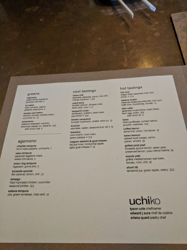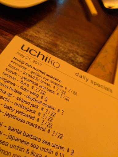 We went to Uchiko on Saturday night to celebrate our anniversary. Weve driven by it so many times, and have always talked about going, so it was great to check it out at long last. We got there at 6:00, and because happy hour ended at 6:30, we went ahead and ordered brussels sprouts and all the makimono (komaki, negihama, and tekka). The chatter about the brussels sprouts is true: *amazing*, and definitely the best $4 weve ever spent on anything. The rolls had an almost buttery texture that melted in your mouth. Weve never been to Japan, so its the best sushi weve ever had. Our server was patient and accommodating and we decided to do a kind of customized omakase with him. We also ordered the special boston fatty tuna from the tsukiji fish market selection, which was $46 for, like, eight tiny pieces, but...no regrets. We also had the hama chili and a couple other fish from the daily specials menu. The sakana mushi was kind of a disappointment because it was too sour and the fish had a bizarre consistency. The "hot rock" was more fun to eat than anything, and didnt have much wow in the flavor department. For dessert, it was the fried milk, and it really is spectacularly unique and delicious. We were a little bit suspicious of the jasmine cream that they also brought out, but the whole thing ended up being a refreshing way to end the night. For sake, we got a bottle of the Yukikage, and it was a perfect accompaniment to all the food. Watch out though: a bottle of sake will really mess you up. Overall, our first experience at Uchiko did not disappoint. Was the bill astronomically high? Yes, but we felt that we had a completely unique experience, celebrity sightings included. Well definitely be back...but probably only for happy hour.