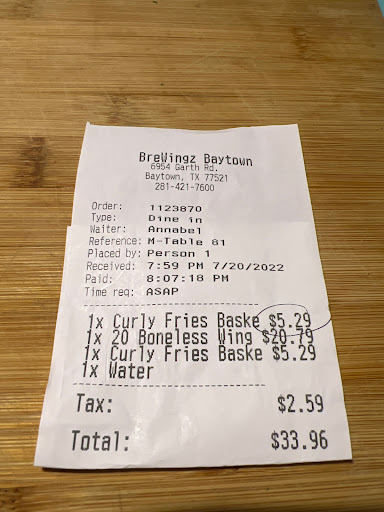 This place was so not worth my time. I was late to work because of the sucky service and I was there lunch hour. Food (salad) took forever my drink was wrong twice, even the manager came to the table which was worthless also. Everything was dis-organized running around like chickens with their heads cut off. Oh and they tried to charge me for drink that clearly was not even touched. Bad day for Brewingz in Baytown which wasnt even busy at the time.