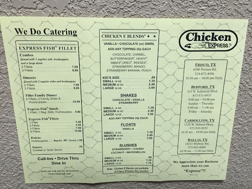 I go to this Chicken Express instead of the one in Irving. I love their drive-ins. I live in Irving and the biggest reason I go here is because when you order a family sized side of fried pickles, they will fill the box up, unlike in Irving. Only reason its not 5-star is because their drive-through is as slow as their drive-in and one time I ordered fried pickles here and they tasted like old oil.