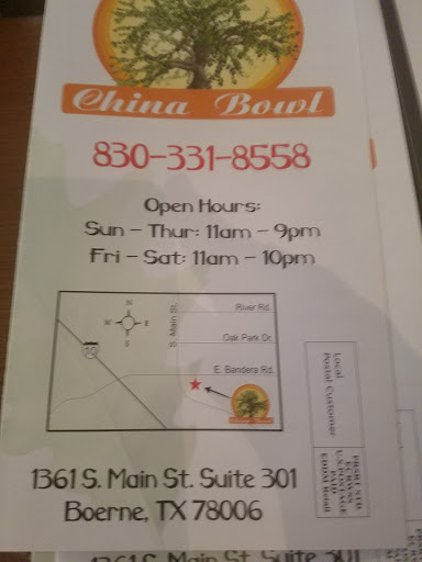 What can I say, when I moved to Boerne I didnt expect to find a good Chinese food place. I drove past the China Bowl a few times and just kept putting off the visit thinking I would not be happy. I decided to drop in one day right around lunch for "The Test". First off the person at the front was very nice and sat me very quickly. Once I sat down I was asked what I would like to drink and served very quickly as well. I like to stick to the classics so I ordered off their easy to handle lunch menu and was ready to go. My soup came out very quickly (Hot and sour) and was just perfect!! HOT and SOUR, I dont get how some places can still get that wrong but China Bowl nailed it!! Right as I was about to put the last spoonful into the soup bowl my main course came out. I love me some generals chicken and I love even more the spin they put on it. It contained some bell peppers and carrots and they both just danced on my taste buds.At this point I blacked out in utter happiness in love with my meal placed before me. I can summarize my visit by saying that the China Bowl is not just for Boerne residents, I am going to tell all of my San Antonio friends to make the trip out my way for some great Chinese Food. Great job everyone and keep it up!!