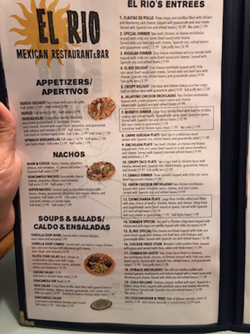 Wonderful service!!! Great Food!!! Awesome margaritas the steaks rival other place in the area for less cost I love the staff at el Rio they are exceptional at what they do and seem to enjoy what they do. My waiter handled a party of seven, made our whole table drinks, and provided us with exceptional service will be Coming Back.