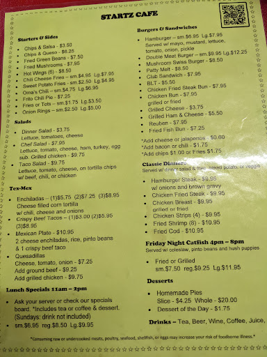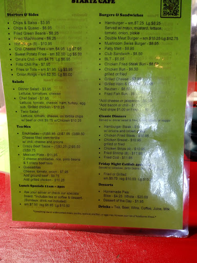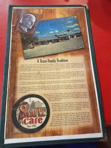 My wife and I have eaten the regular Friday night grilled Catfish plate with Pinto beans and Cole Slaw, every Friday night for the past two years or so. Obviously we love it. I dont even know where else in this area you can find grilled catfish these days. Even "The Antler" in Spring Branch took it off their menu several months ago. The catfish at Startz Cafe is very good.. The serving size is generous and the price is right. Just remember to bring cash, credit cards are not accepted.