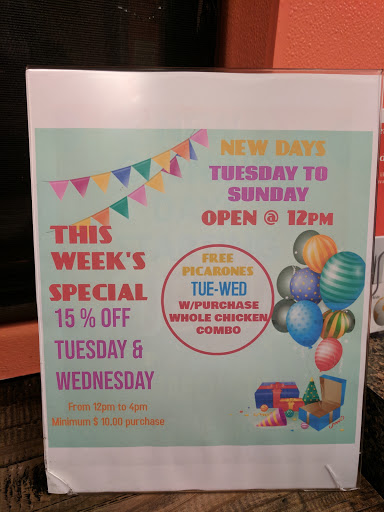 Great place to eat Peruvian rotisserie chicken. Highly recommend to call before time and make your order. The rotisserie chicken is so yummy that they go fast. Love it!!!!