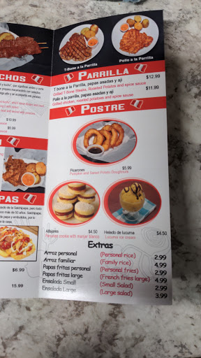 Verdadero pollo a la brasa peruano con su rachi, su pancita, su anticuchos, su cafe cajamarquino y de postre sus picarones. Un verdadero rinconcito peruano.