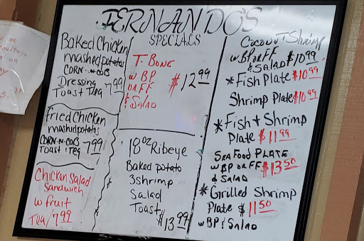I go to Fernandos regularly. Tonight my husband and I ordered the Talapia plate that was listed on the wall as $6.75. When we got to the cash register to pay, it was $8.99 per plate since we had ordered GRILLED. There was no reference to difference in prices of grilled or fried. and we were not told of this when we ordered. We had previously gotten grilled there and had not been charged the additional. So be careful of what you order. Like his food but not the price charged without being told as it was posted on the wall as a special.