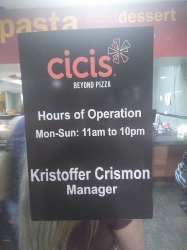We visited for the first time Sunday, dec 11 around 1:30. The cashier was friendly and patient with us while we wrangled our 3 toddlers. Thats about where the positive review ends. Upon walking further inside my husband said he thought maybe their a/c wasnt working right because there was a lot of condensation on the floor. It was slippery and humid all inside the building. Not too many tables dirty upon entering.. maybe one or two. Pizza was so-so.. dessert pizza was a little more gooey than Im used to from Cicis. Salad was okay, but the toppings were a little slimy, I passed on most of them. There was a weird musty smell over by the game room, and the change machine wasnt working. I didnt go in the restroom, but my husband said the receptacle on the wall was grimy. Probably wont be back, just choose another location.