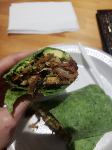 Organic, vegan and vegetarian options. Delicious hot wraps with grilled veggies. Tried the tofu beef wrap and spicy bean burger and Im completely satisfied. Also had Thai tea and iced coffee with tapioca. Great local business and great prices.