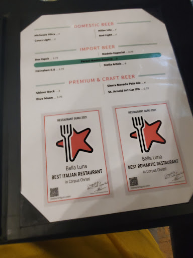 First time there today & I loved it the food to the staff & the environment with nice music to enjoy lunch or dinner & they also have comedy show..I love it all Ive been to others here in Corpus Christi not mentioning no name but so far so good this place fits us better.❤ I cant wait to bring my family from San Antonio, TX over to Bella luna I know they will enjoy & must invite a friend & his wife hes a direct. I know they will enjoy it.very nice especially the drinks