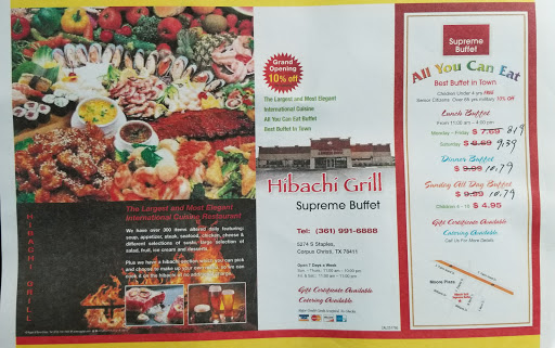 Best Buffet so far in Corpus Christi. Seafood, Sushi, Steaks, Hibachi Grill, Chinese, American, Mexican and Italian food. Largest Buffet with a large assortment of items to pick from. Could be Improved with the addition of Crab Legs and Oysters on weekends. This place has the best Menudo in Corpus Christi.