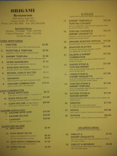 Origami is the greatest! I have tried EVERY sushi restaraunt in Corpus Christi, and hands down, this is the finest. I have been going here every chance I get for 5 years, and there really is no comparison. The sushi chef (Taka, short for Takagi(his last name)) will remember regular customers by name, and he lives by the Japanese tradition of honor. I consider it a great privelege to go here, and always tip not only the gracious wait staff but also the chef himself. He remembers this, and every plate I recieve from him always includes something extra and special. In regards to the food, the sushi pieces and rolls are much larger than anything youll get elsewhere, yet they are still much cheaper. The "menu food" is also quite delicious, and even the new sushi eaters who seem to get cream cheese (ack!) on everything can find a nice corner booth to enjoy their dinner. The atmosphere is quaint, as any artistic venue should be, with dim lighting and a staff that is more like family. Youll find none of the Americanized crap here that you so often find in our sushi restaraunts because this one is actually owned and operated by a straight-from-Japan chef. I have recently moved away from Corpus, but will always remember this place and its people for the wonder that they are. Certainly a diamond in the pile of sand that is Corpus cuisine.