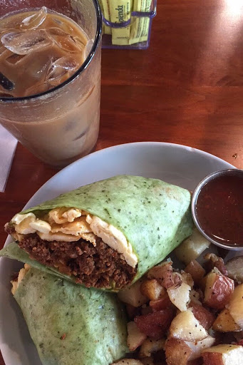 So lets start off with my simple order of an ice latte with almond milk. Unfortunately I was disappointed from the start the didnt have almond milk so I settled for the soy milk. When my latte arrived not only did it taste like water but looked like the after effect of what a snow globe would look like but the snow was my soy milk. A simple coffee in a place with the name Cafe in it shouldnt be such an painstaking task. So on to my order. This was my first time here so who knows best on whats a must on the menu? Of course the staff.... I was recommended the french toast. When it arrived it didnt look like anything I had seen from past post on here. It was a lot larger and the bacon tosed on to beside long cut banana slices. This was not what I expected but I was hungry and I went for it. The first bite wasnt to bad as the crust had some strength and texture to it but that was the best part of the french toast. The next few bites just got softer and softer till it was more of a mush. If it wasnt for the brown syrup I probably would have stopped after the 2nd bite. There was one saving grace and that was the bacon. It was full and thick with almost no fat. If Im going to state an issue I will also post my solution. The bread needs work it had a frozen taste to it. Not sure if the toast is made fresh or if it sits premade but something was way off. The syrup should be on the plate, drizzled on top lightly and a small amount brought out on the side. The banana should be chopped in small slices as it would make the process more enjoyable.