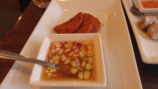 Went to this place for a business lunch. Small restaurant - nothing fancy. Curry puffs were pretty good actually! Cream cheese rolls and corn patties were greasy but tasted good. Fresh shrimp spring rolls - we were focusing on finding shrimp in there! Bistro B has much better. Tom Yum soup was very salty (like most entries). None of us could eat it because of the salt content. I have ordered salmon curry. The menu said grilled, but it was actually battered and fried, so I asked to exchange it. What I got back (had to take it to go at that point), was a small piece of fish looking like wood and a curry souse in a separate container! I have not seen a curry looking like this before. I will not go back.
