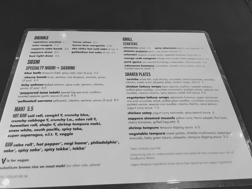 Some of the better sushi we;ve found in the DFW area. I highly recommend the snow white rolls, yellowtail rolls and spicy tuna rolls. It is possible that we showed up just a little later than most (9:00pm) but service was a little lackluster at that point. Our first waiter only showed up once to give us our menus, we then waited for a while although clearly showing that we had made our selection. After 10-12 minutes, we had to grab another waiter to help us out. Throughout the dinner, we also had to ask 4 times to get a water no ice, as they kept bringing it with ice. Food was good, so its likely that we will give their service staff another chance to make a better impression.