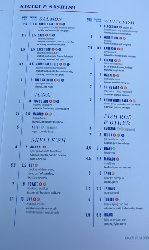 Quality vegan options also offered here! Great environment for those looking for a cool atmosphere. Seating options: diner, lounge, bar, and outdoor. Inside-Color concepts, Americanized-asian decor, and marine animal videos immerse you in an aquatic experience. Outside- outdoor heating accomodations when it is cold, sturdy outdoor furniture, and an upscale shopping center makes up the landscape Quality sushi rolls ($) and drinks ($$) leave you wanting more. Short waiting times (if any) 4 stars only because every time I visit, their kitchen "ran out of eggplant" striking off a couple options.
