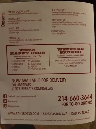 It doesnt matter what you go to Cane Rosso for because its always delicious. Ive been for birthdays, date night, end of semester stuff, its Thursday, and it doesnt matter. Always delicious, always welcoming, and always impressive. The waitstaff at both locations does a great job to make you feel welcome and cared for despite always having a packed house during prime hours. 10/10 would recommend.