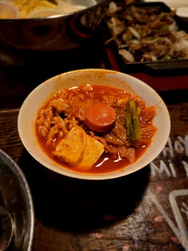 The plates we ordered: ramen as an appetizer, seafood pancake, spicy squid and broiled pork, spicy seafood soup and an apple soju. The atmosphere feels like Korea and the service is fair. Although, the pancake is good but the sauce was too salty. The spicy seafood soup and ramen was alright compared to others I had before. The place is more of a bar/hangout than a restaurant in my opinion because the soju and spicy squid with broiled pork stands out more.