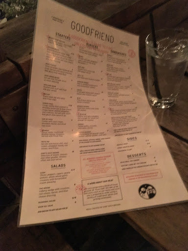 It was a rare evening where I craved a solid burger and Goodfriend delivered! I went with the original P.L.O.T and it was delicious. Only 1 cider on tap. Indoors was kind of dark,but outside was a nice setting. Im looking forward to going back and trying another burger on their menu with more unique ingredients. They will get a 5th Star from me if they add more ciders!